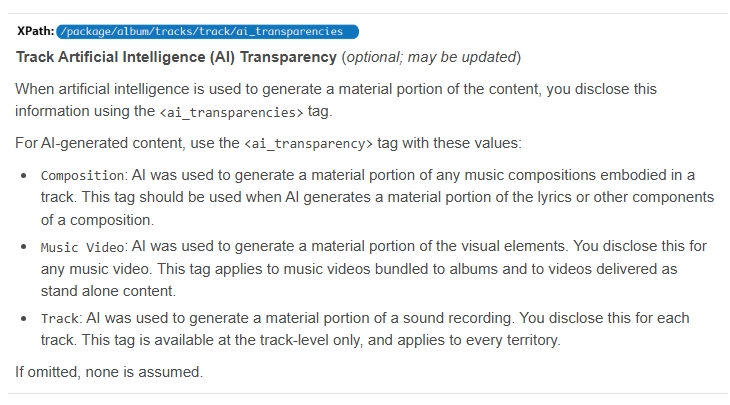 The artwork tag, applied at the album level, flags when AI has been used to generate a material portion of static or motion graphic artwork.
