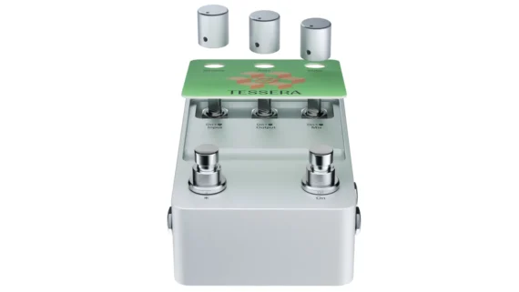 Two footswitches handle control (right = on/bypass; the left is freely assignable on tap or hold), with a multicolor LED that changes state based on the left switch’s short/long latch. The three front-panel knobs pull double duty—hold On to access analog preamp level, master output, and wet/dry mix—and the configurable I/O lets you switch the pedal between stereo, mono, or mono-to-stereo.