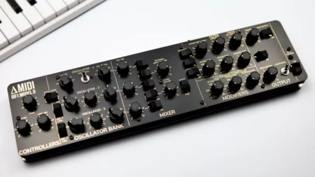 Available in black with gold-plated lettering, the MIDI 001:model D features three layers of fibreglass reinforced laminate and an additional sheet layer of aluminium. It is Eurorack-compatible and hand-assembled in Poland.
