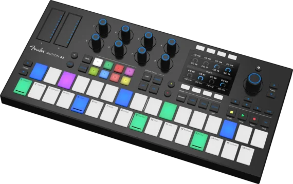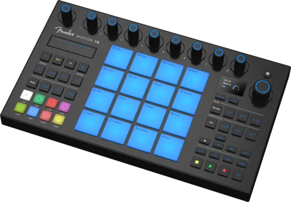 Two models have been unveiled, Motion 16 and Motion 32, both of which feature RGB polyphonic FATAR® pads, illuminated encoders and touch strips, along with timeline navigation and session controls. Fender 32 has 32 pads arranged in a keyboard-style layout with a larger screen, while Fender 16 is a more affordable option with a 4×4 grid of pads.