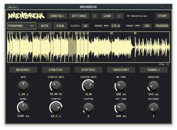 When you want to go deeper, the CAREFUL! mode provides granular control over five of AmenBreak’s effects. Reverse does what you’d expect, Stretch time-stretches the audio using granular synthesis, Stutter introduces rapid repeating stutter effects, Tapestop emulates a tape machine stopping and starting and Tunnel creates a momentary delayed loop or transition using filtering and volume changes.