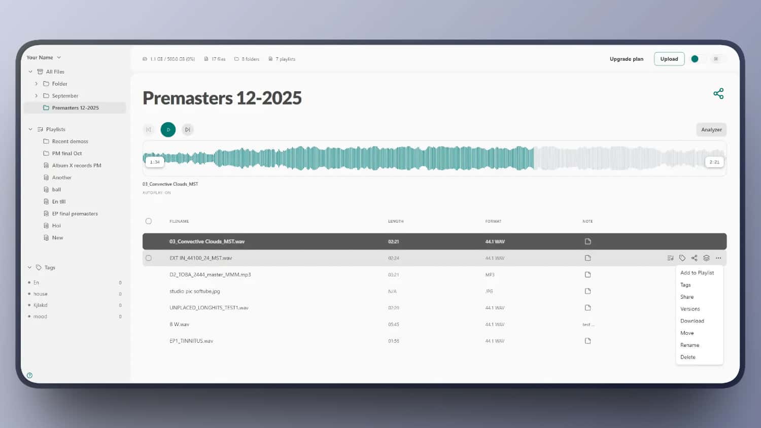 - Smart Organization – Keep projects tidy with folders, playlists, versioning, file notes, and tags.