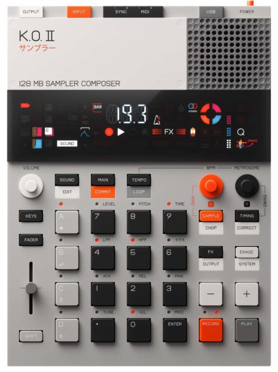 The EP–133 K.O. II lets you record sounds around you, sequence your samples and loops, tweak and automate filter, pitch and more, add stereo effects, compressor and punch-in effects, all on a chonky device with retro-sexy vintage calculator vibes.