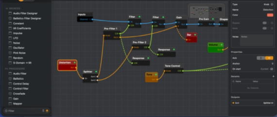Users can assemble signal paths, tweak parameters, visualize waveforms and spectra, and hear results instantly — all without writing a line of code.