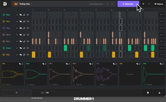 Drummer-1 generates drum patterns algorithmically, while offering hands-on editing, humanization controls, and the flexibility to export either MIDI or audio.