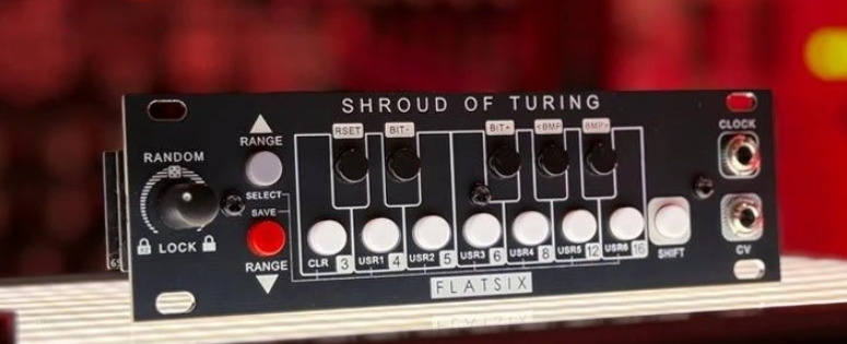 FlatSix Modular shared this video to introduce the Shroud of Turing, 16-Bit Shift Register Sequencer with Musical Quantization – a module in the Intellijel 1U format that combines the capabilities of the classic Turing Machine shift register with a capable and playable note quantizer.